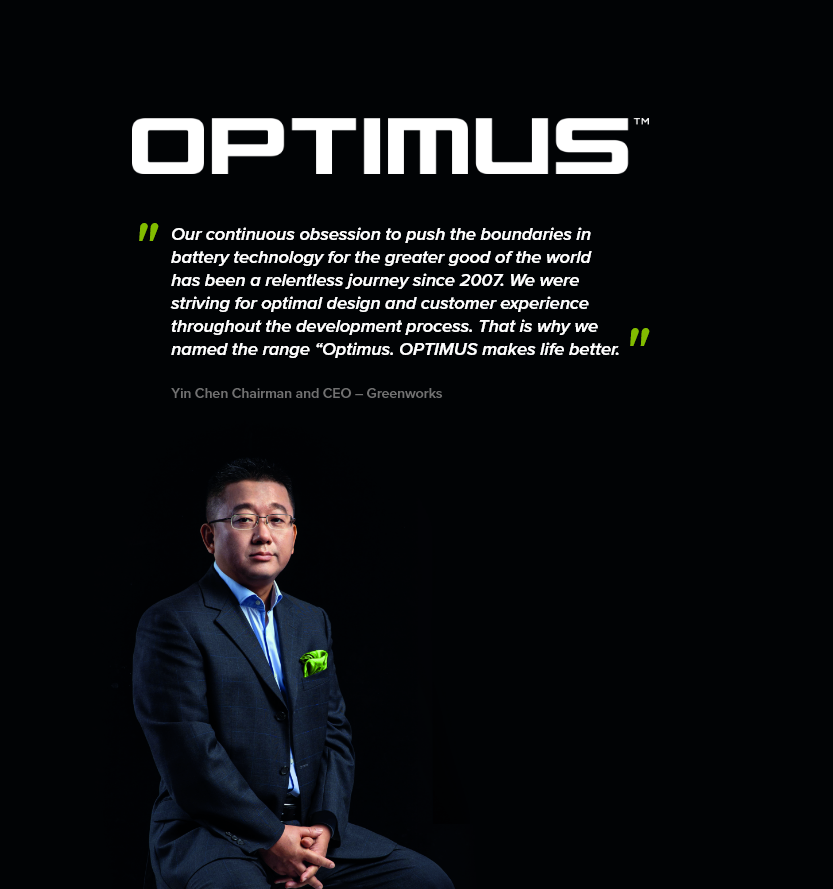 Optimus means the best of the best. Here at Greenworks we have put our best foot forward to create the industry leading power to weight ratio in not one, but an entire lineup of products. Products that deliver the power and performance you need day in and day out. Our Optimus lineup brings the best qualities a product has to offer addressing specific problems and challenges that end-users have expressed to vastly improve the user experience.