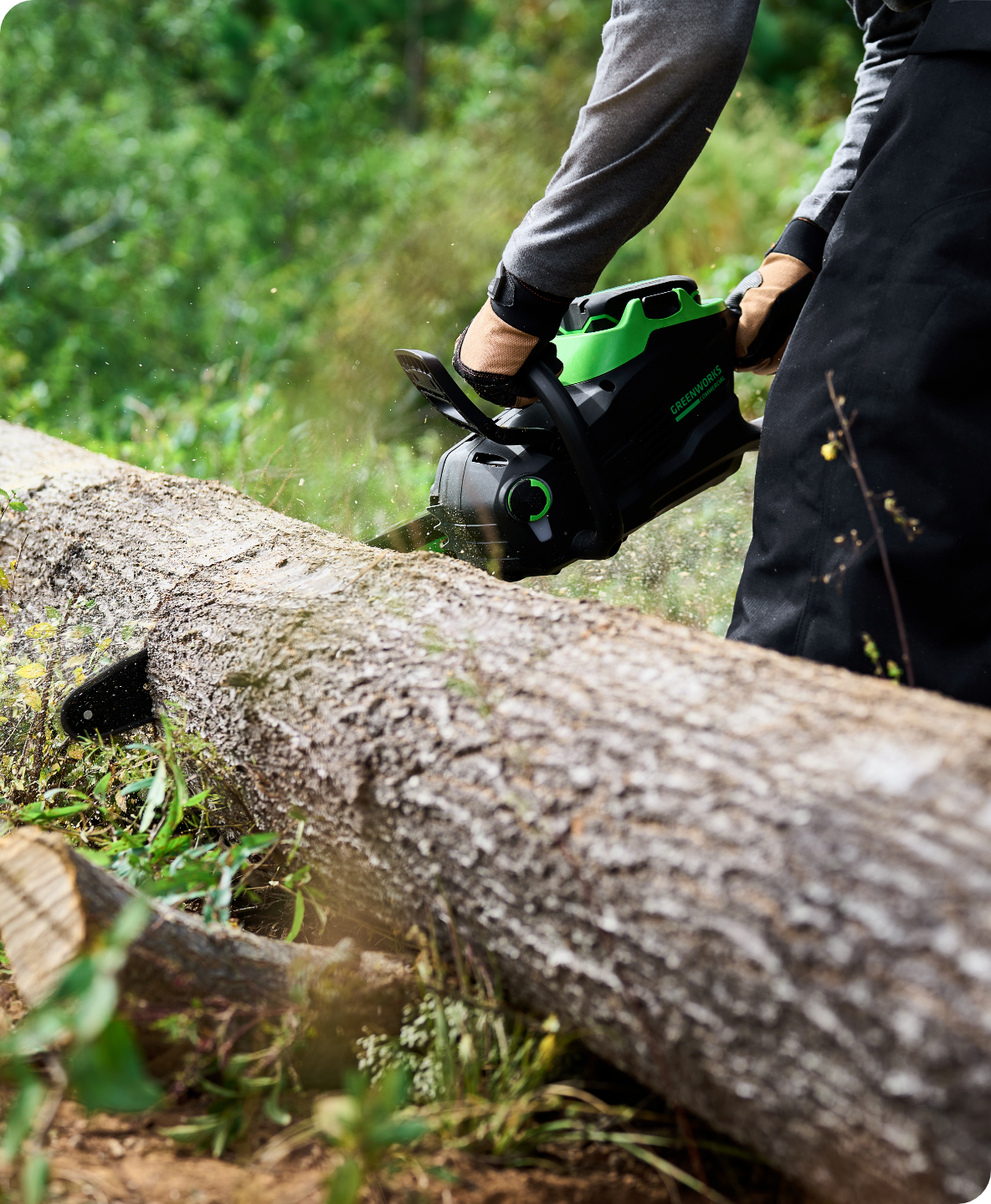 With the equivalent power of a 3.2 HP engine and 45cc displacement gas engine, this ultra high-performance chainsaw leverages a built-in commercial-grade Brushless Direct Drive Motor and lithium-ion batteries to provide the power and torque necessary to cut faster than gas-powered chainsaws at only 12.9 lbs. operating weight.