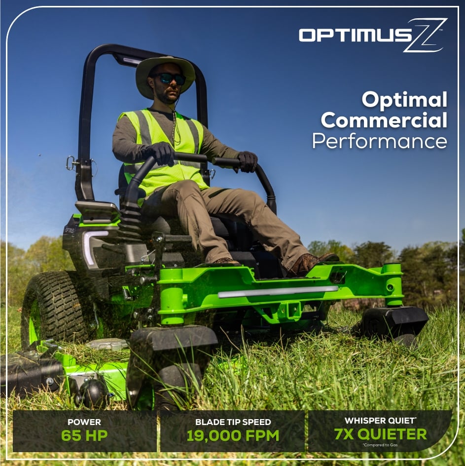 OptimusZ is the next generation of battery powered commercial grade equipment. It is a battery powered ride on mower which not only delivers what a traditional gas mower delivers, but also unleashes many more features and much more value than any other zero turn mower in the market. The OptimusZ is simply the best commercial zero turn mower on the market! Why, you may wonder. This is because it has been optimally designed to deliver: