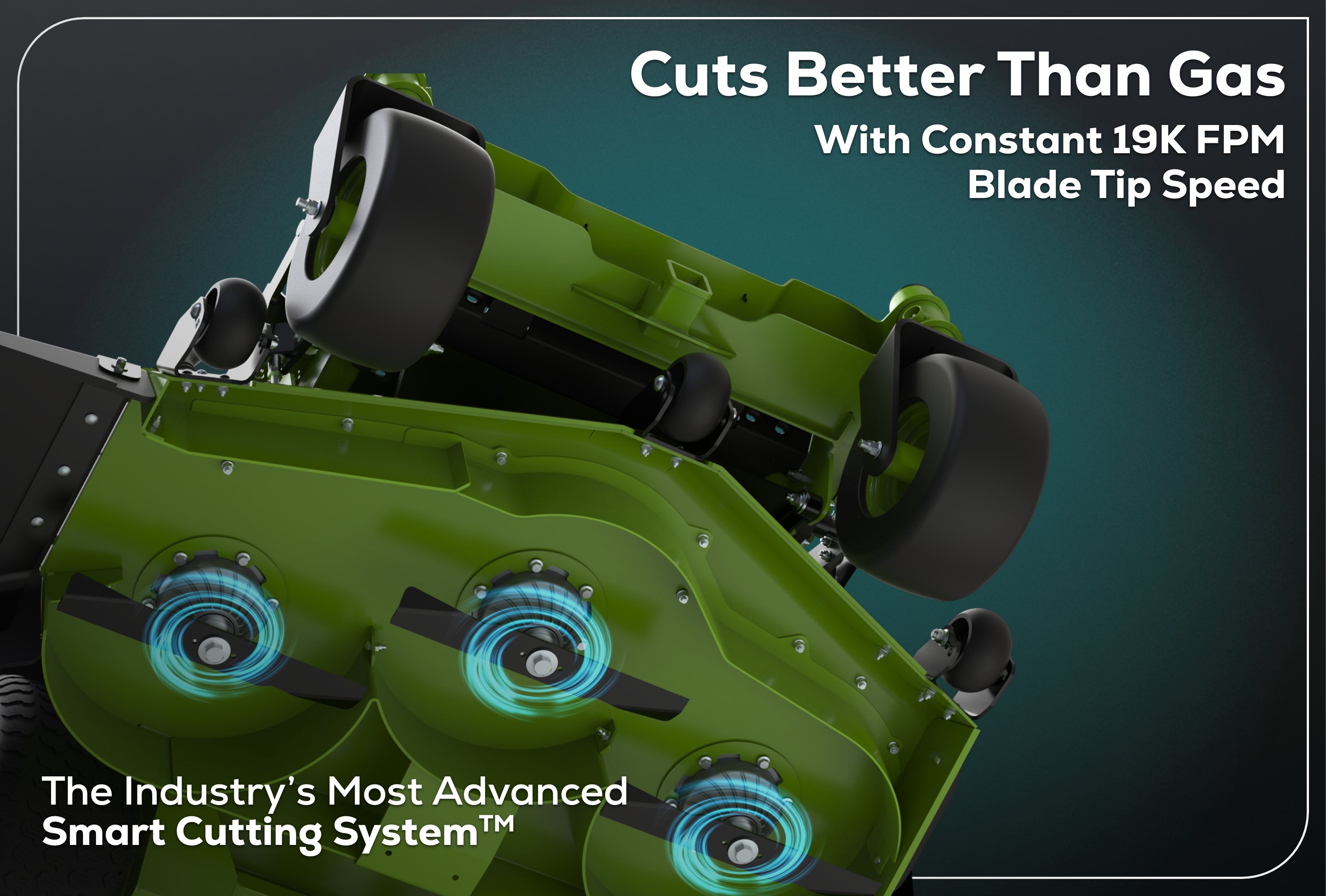 Optimized to provide all-day cutting up to 8 hours and up to 21 acres of mowing on a single charge, this ultra-high-performance zero-turn mower is powered by the 82v high voltage MEGA 24K battery that delivers industry leading equivalent power of a 65HP gas engine to confidently tackle the most demanding commercial applications. It is capable of achieving and sustaining a constant 19K FPM blade tip speed to never slow or bog down under heavy or wet grass conditions.