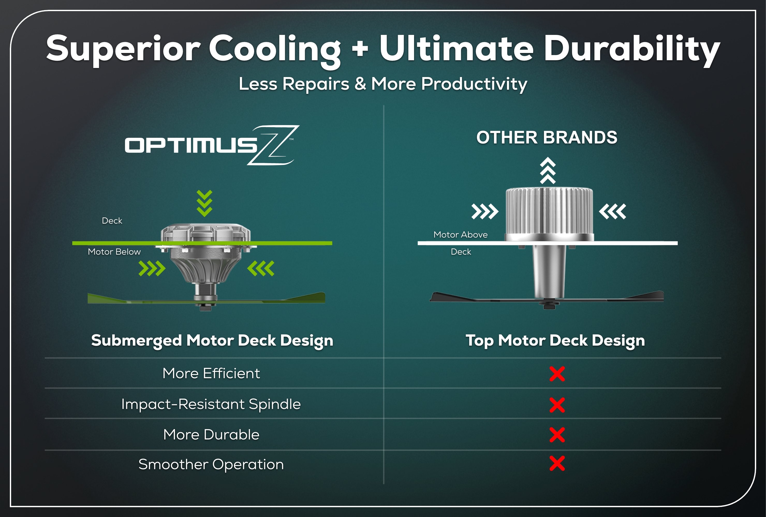 OptimusZ sets itself apart by cleverly integrating 70% of the blade motors beneath the deck, offering unparalleled durability, cooling efficiency, and prevents grass wrapping around the spindle.