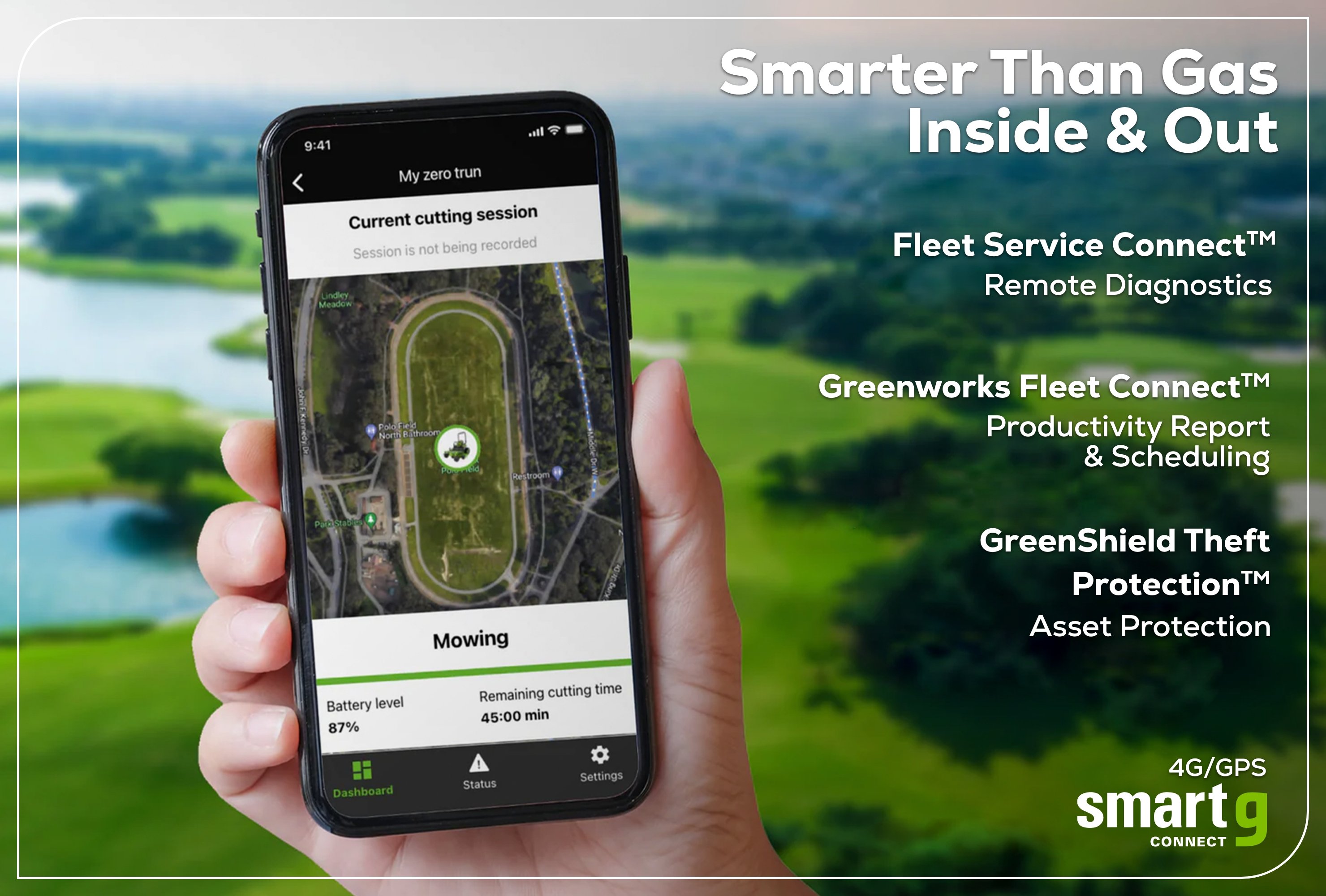 - Greenworks Fleet Connect™ for productivity report and scheduling