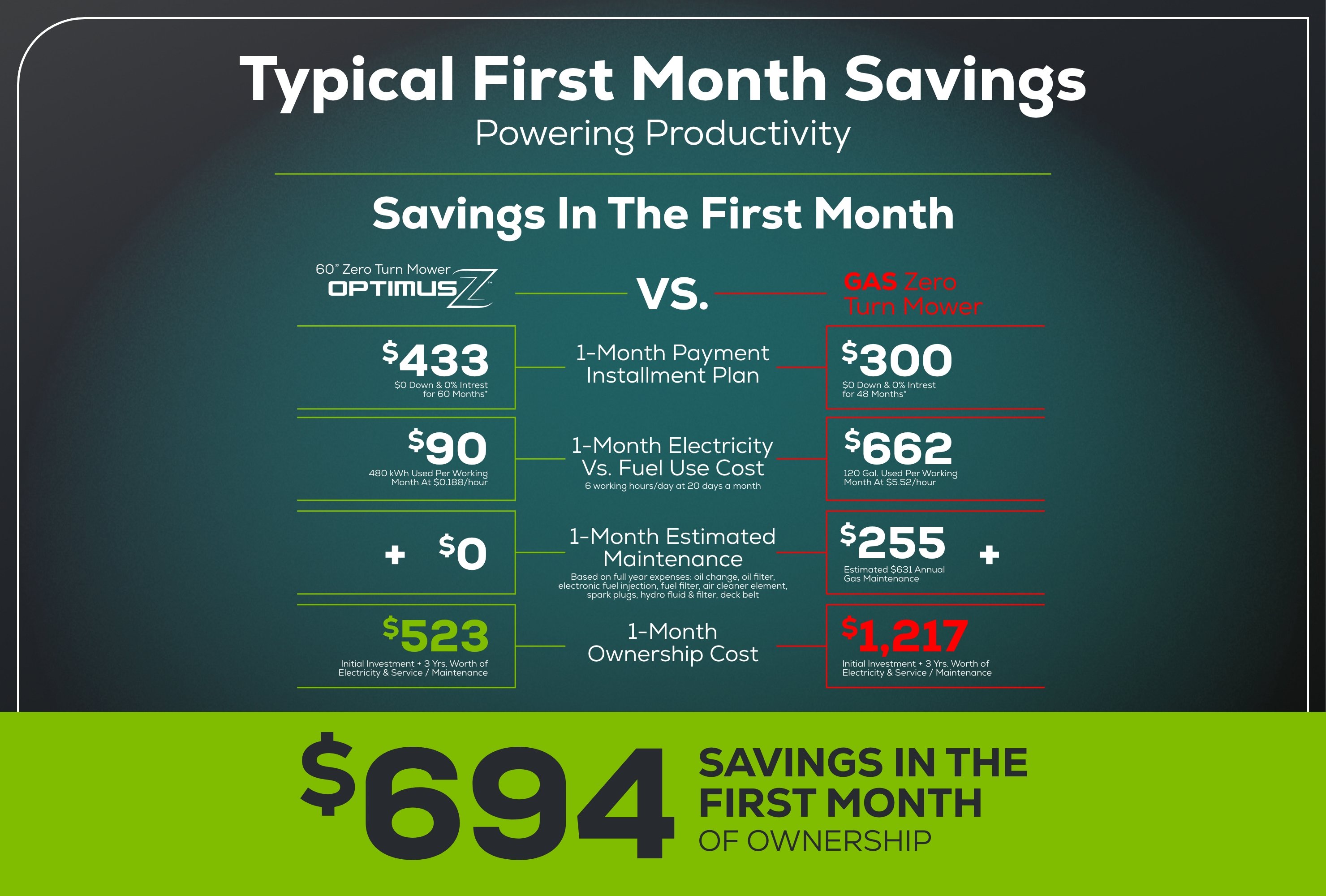 Transitioning to battery does not only save on gas expenses. It also saves time avoiding impromptu visits to the gas station in rush hour traffic. What about maintenance? With no belts, no spindles, no oil or filters you also save on maintenance: both time and money. As a matter of fact the OptimusZ is a maitenance free zero tuen mower for up to 2000 hrs.