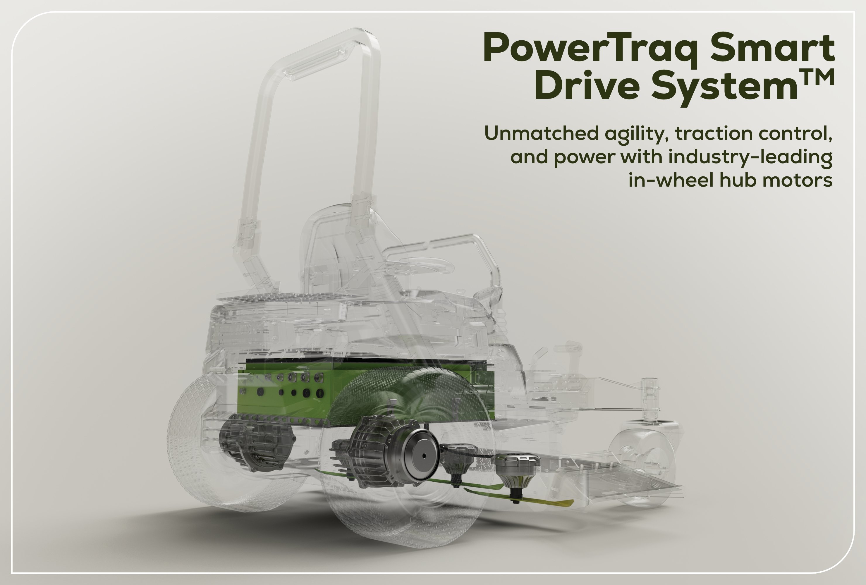 The PowrTraq Smart Drive System™ does not rely on hydraulic transmissions to power the wheels. Thanks to the 2 independent high quality in wheel hub motors the drive system is maintenance free for up to 2000 hrs. of use. Save money and time; and never worry again about making sure you hit your transmission hour intervals.
