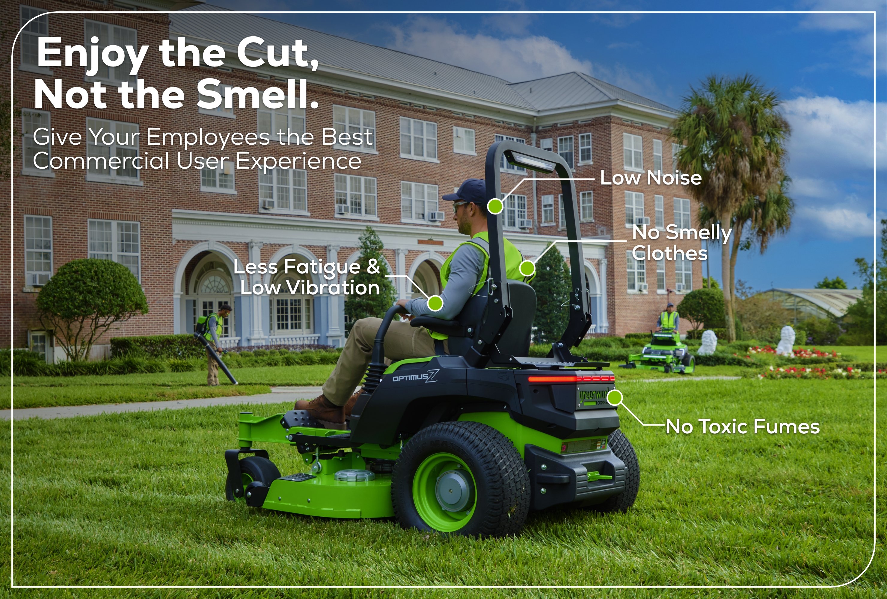 Imagine a landscaping work day with no fumes, no toxic emissions, no smell, no headaches, no cleanup of accidental spills, no burns from overheated equipment, low vibration, and little to no noise. That is every day on an OptimusZ
