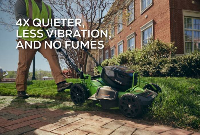 With 90% fewer parts compared to traditional gas mowers, the 21" Brushless Push Mower requires virtually no maintenance.Greenworks© Commercial 21" push mower provides a cleaner, more consistent cut. That means no more dealing with oil, spark plugs, fuel filters, air filters, gas fumes, and emissions.