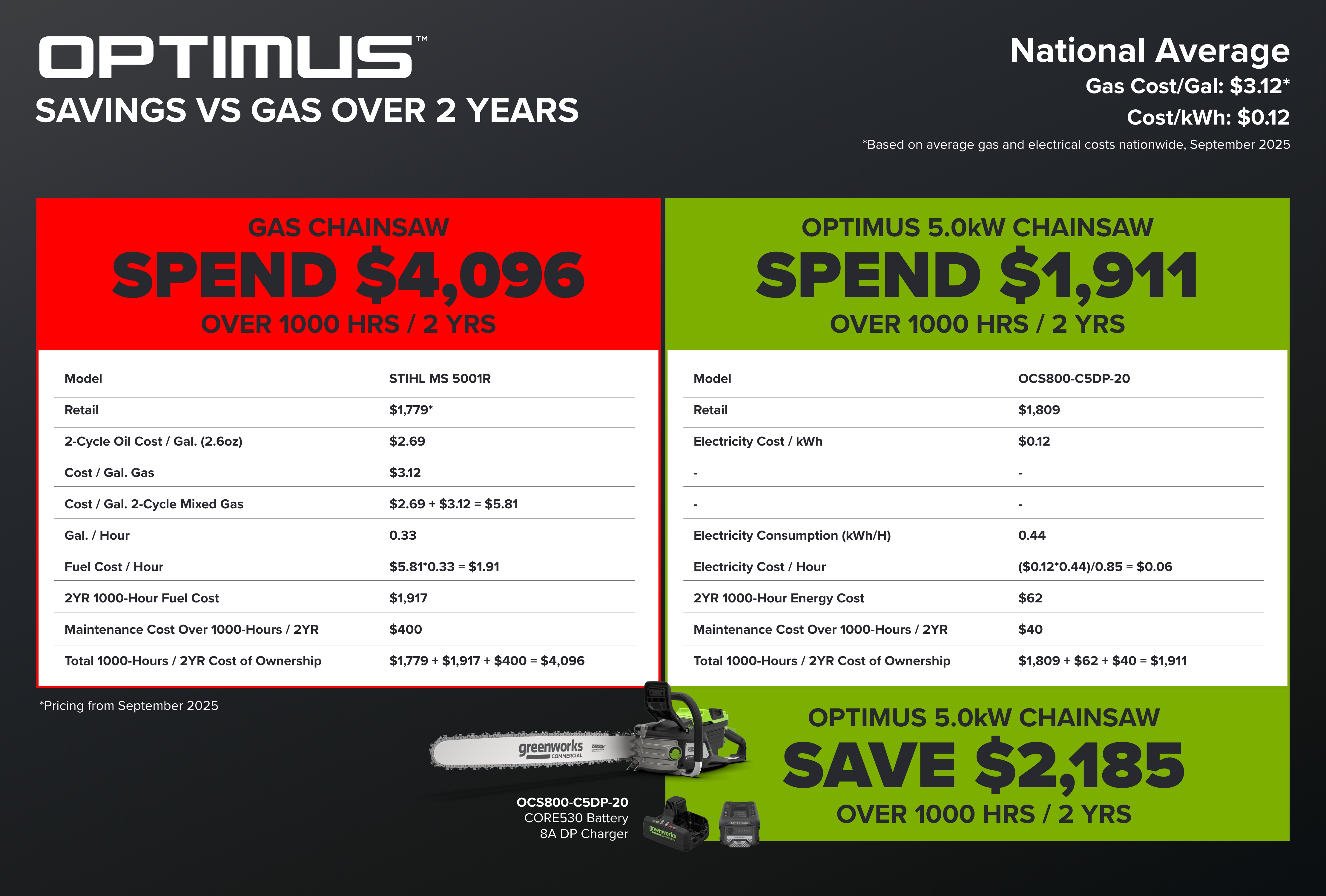 Meet the H.O.G! The new High Output Gasless chainsaw is the most powerful battery chainsaw ever designed. It delivers an earth-shattering 5.0kw max power or 80cc gas equivalent power.