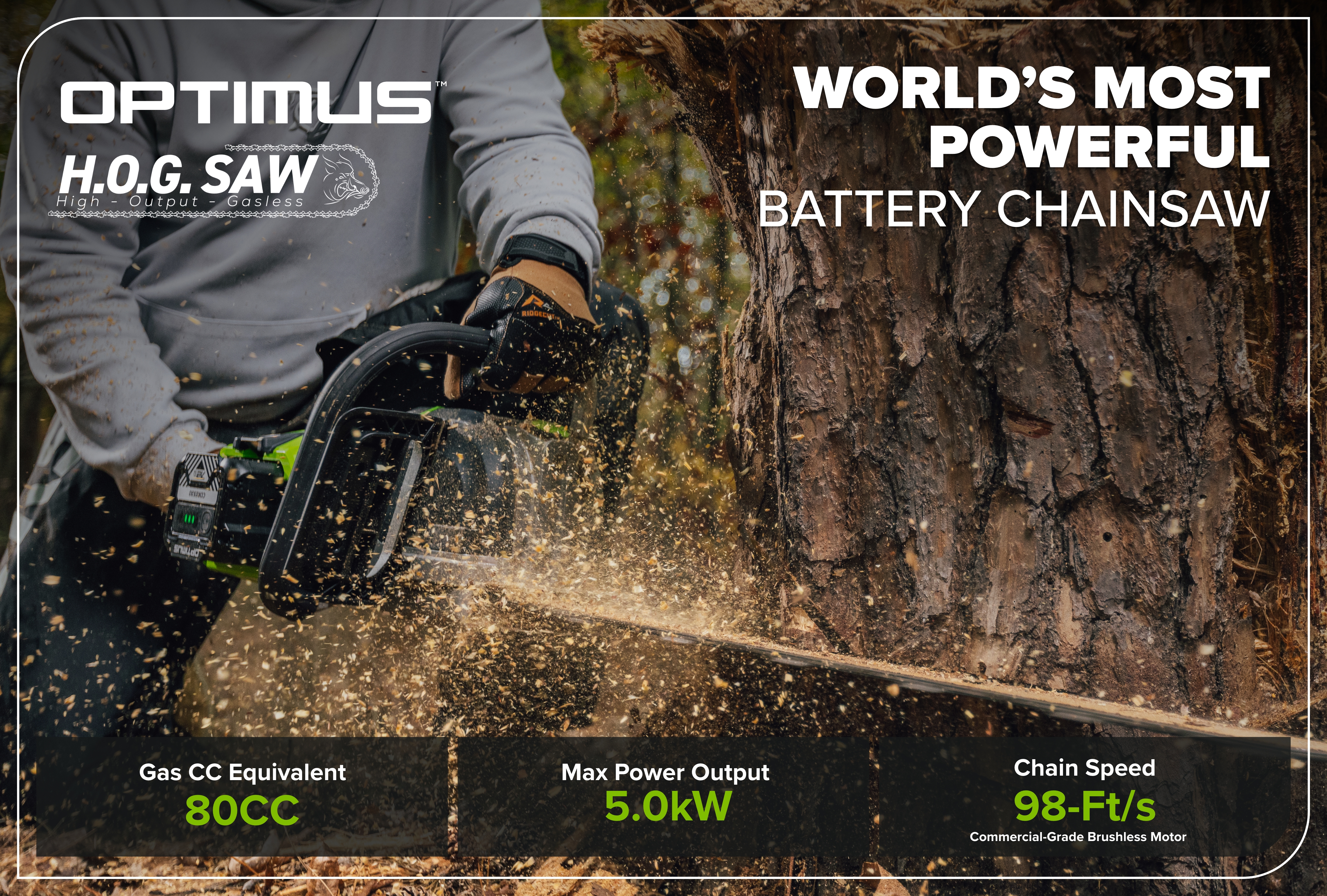 Meet the H.O.G! The new High Output Gasless chainsaw is the most powerful battery chainsaw ever designed. It delivers an earth-shattering 5.0kw max power or 80cc gas equivalent power.