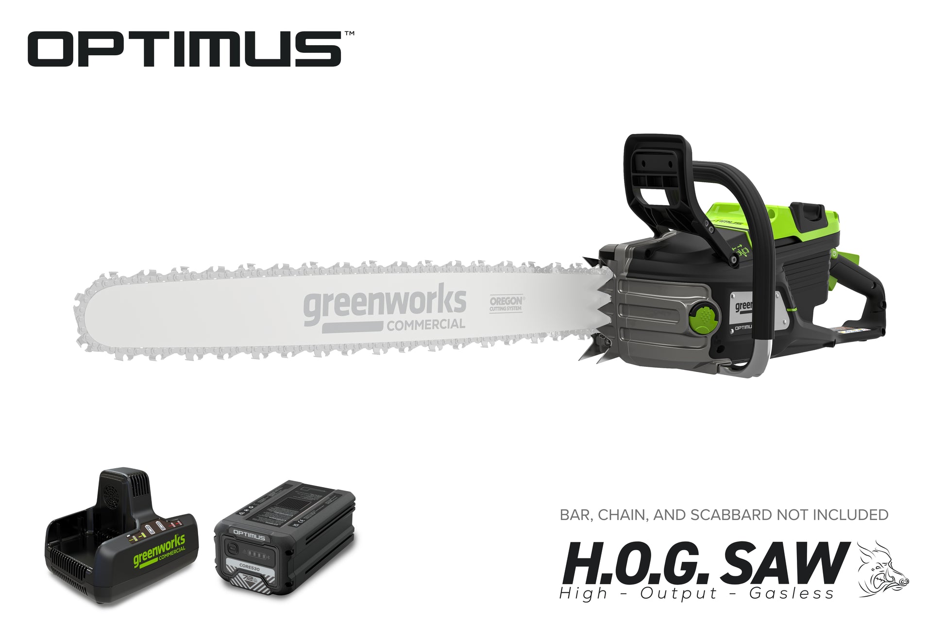 Meet the H.O.G! The new High Output Gasless chainsaw is the most powerful battery chainsaw ever designed. It delivers an earth-shattering 5.0kw max power or 70cc gas equivalent power.