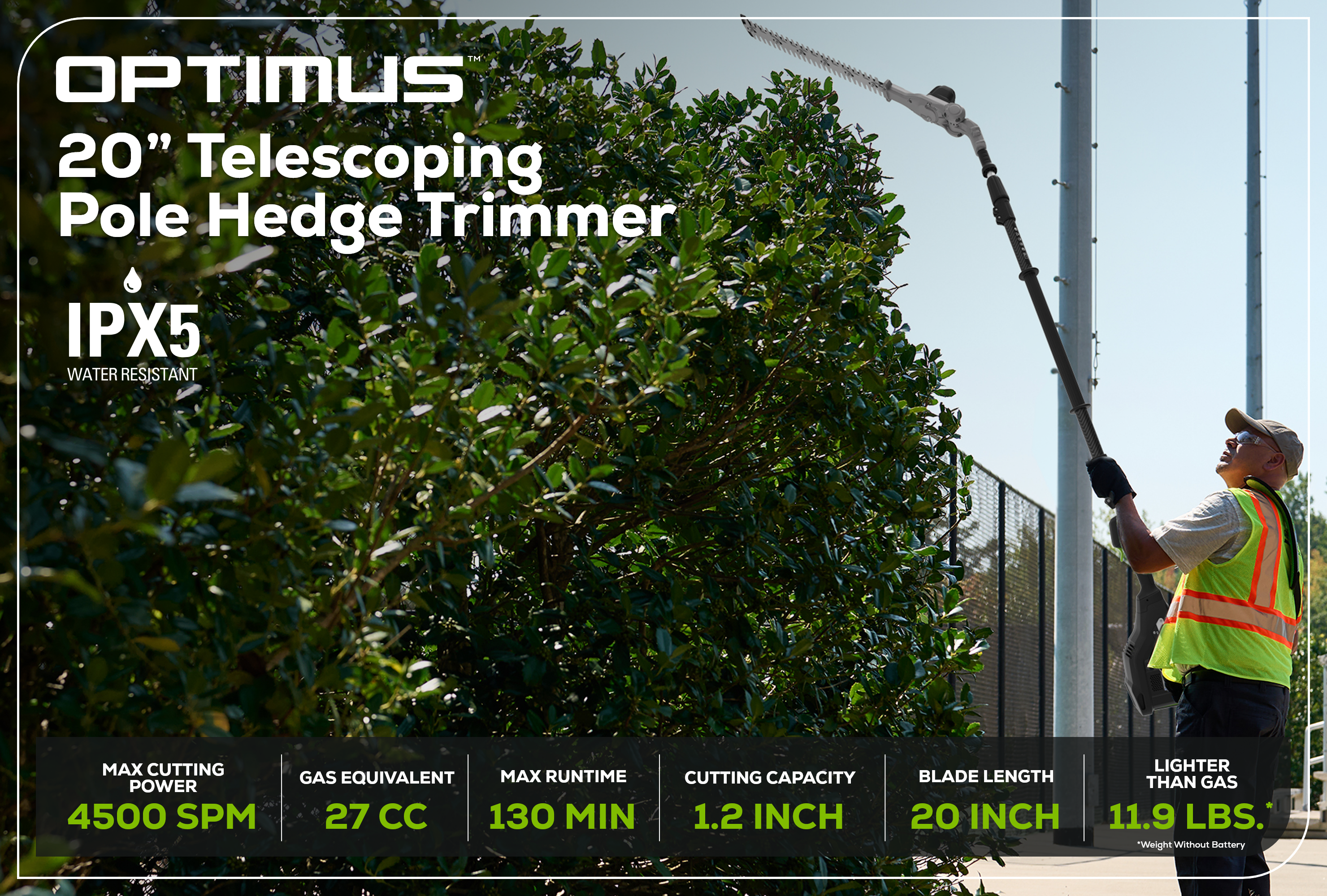 The Greenworks Commercial Optimus 82V Telescoping Pole Hedge Trimmer empowers professional landscapers to do more in less time. Designed to outperform gas units, it delivers 27cc gas-equivalent power while eliminating the headaches of fueling, exhaust, and intensive maintenance.